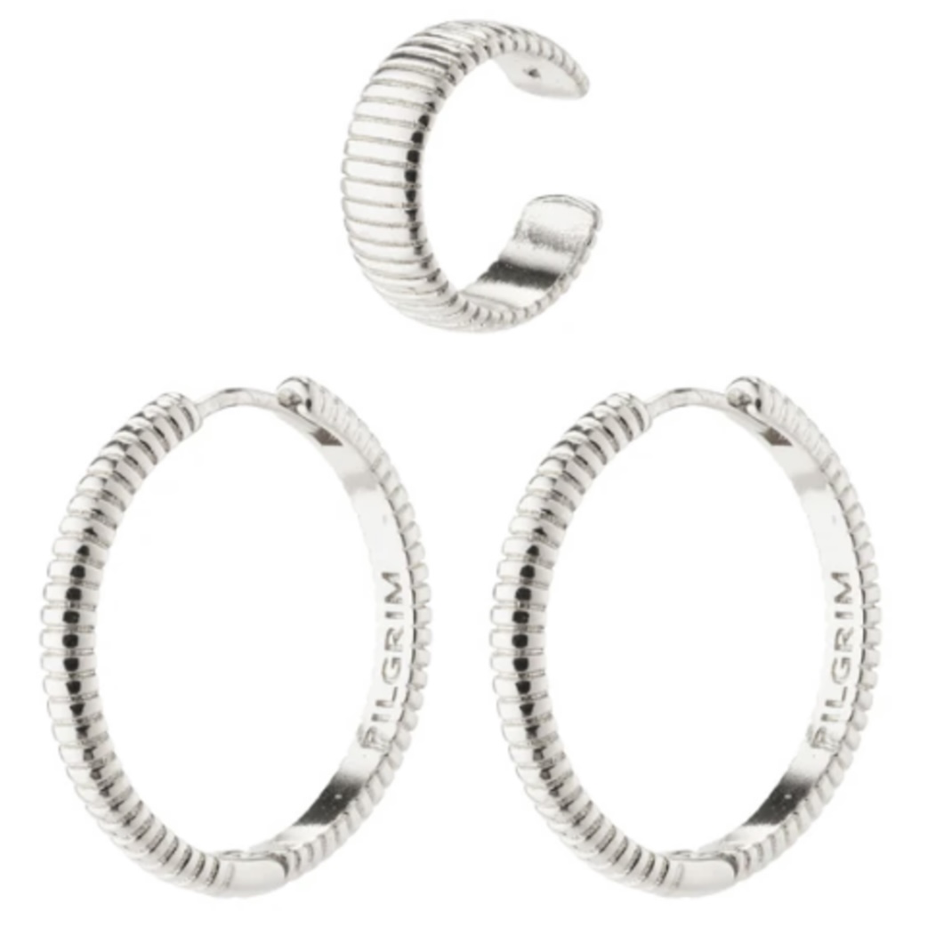 Σκουλαρίκια κρίκοι PILGRIM σε ασημί χρώμα, επαργυρωμένα και κατασκευασμένα απο τουλάχιστον 75% ανακυκλωμένο υλικό (99% ανακυκλωμένος ορείχαλκος και 1% επιμετάλλωση). Φινιρισμένα με ειδικό βερνίκι για την μέγιστη αντοχή στον χρόνο. Διακοσμημένα με διάφορες χαράξεις. Ένας συνδυασμός με σκαδιναβικές επιρροές ο οποίος ταιριάζει σε κάθε στυλ. Περιλαμβάνεται ένα ear cuff. Διάσταση: 2,2εκ.