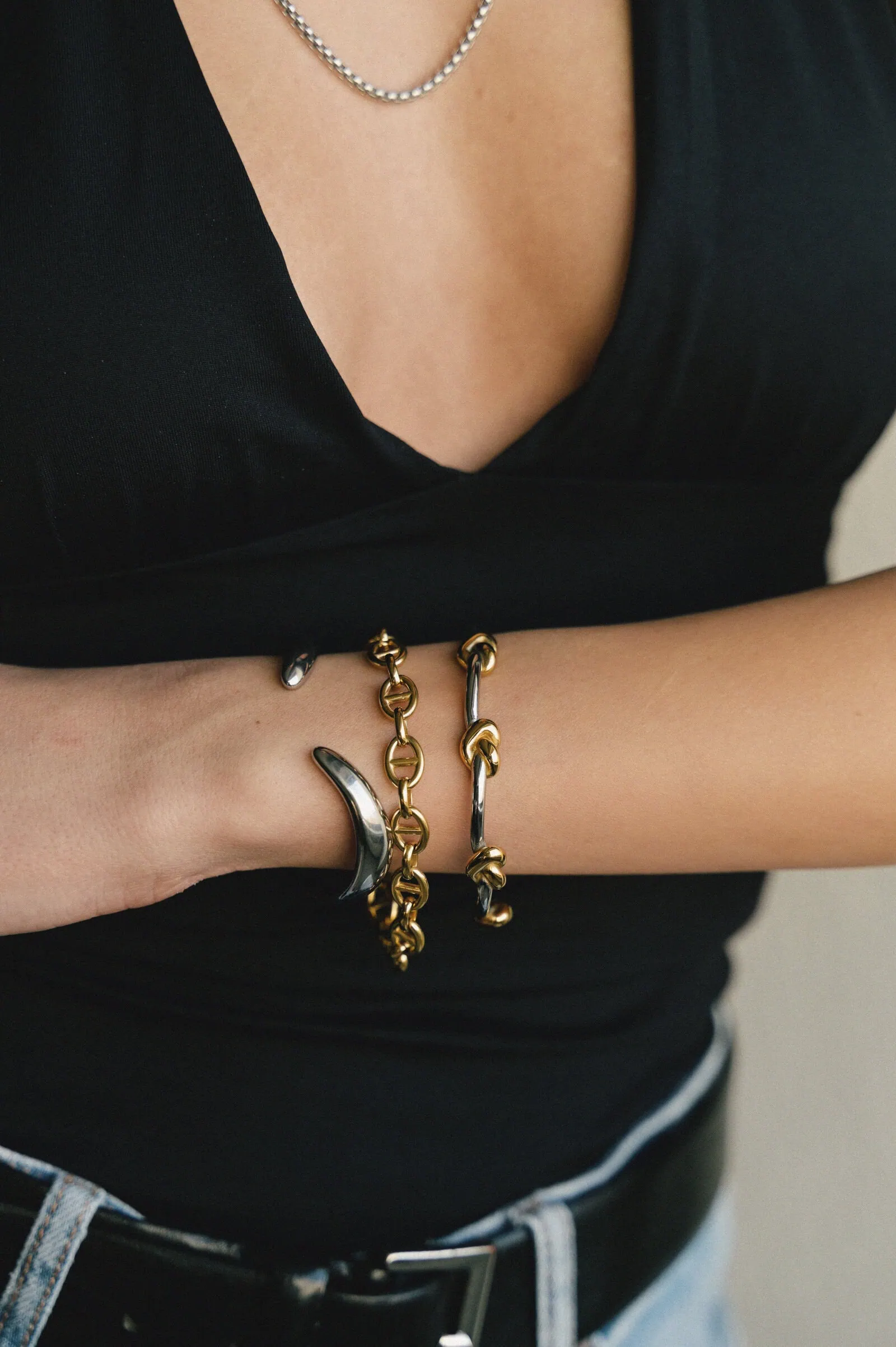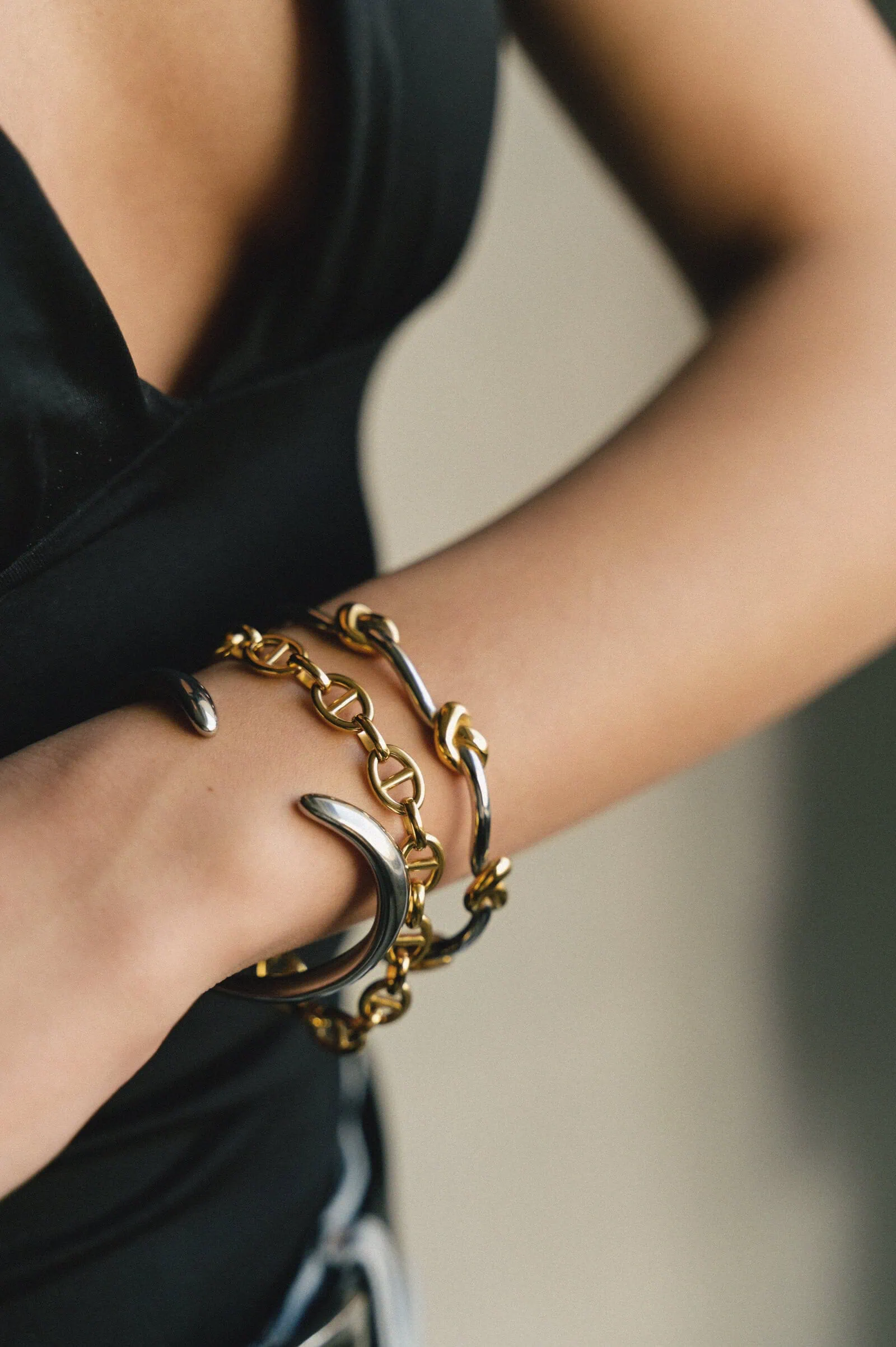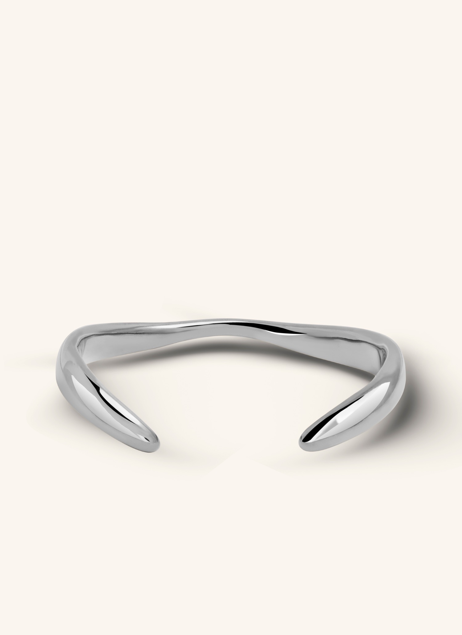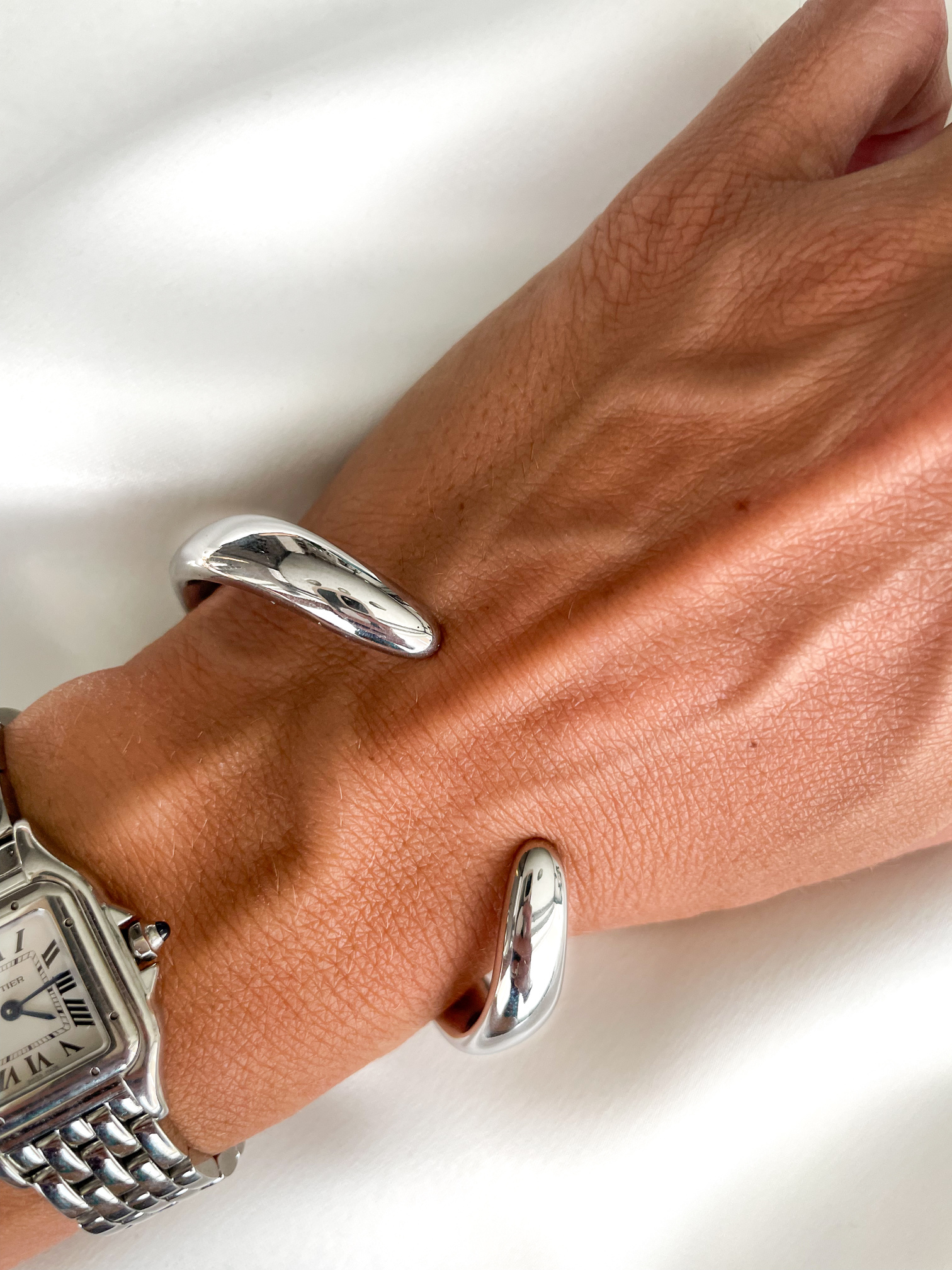 Το Best Seller ασημί βραχιόλι cuff από ατσάλι με δυναμικό, οργανικό σχήμα. Ιδανικό για clean εμφανίσεις με σακάκια ή ολόσωμες φόρμες.Διαστάσεις: 0,82cm πάχος – (5,80cm εσωτερική διάμετρος)