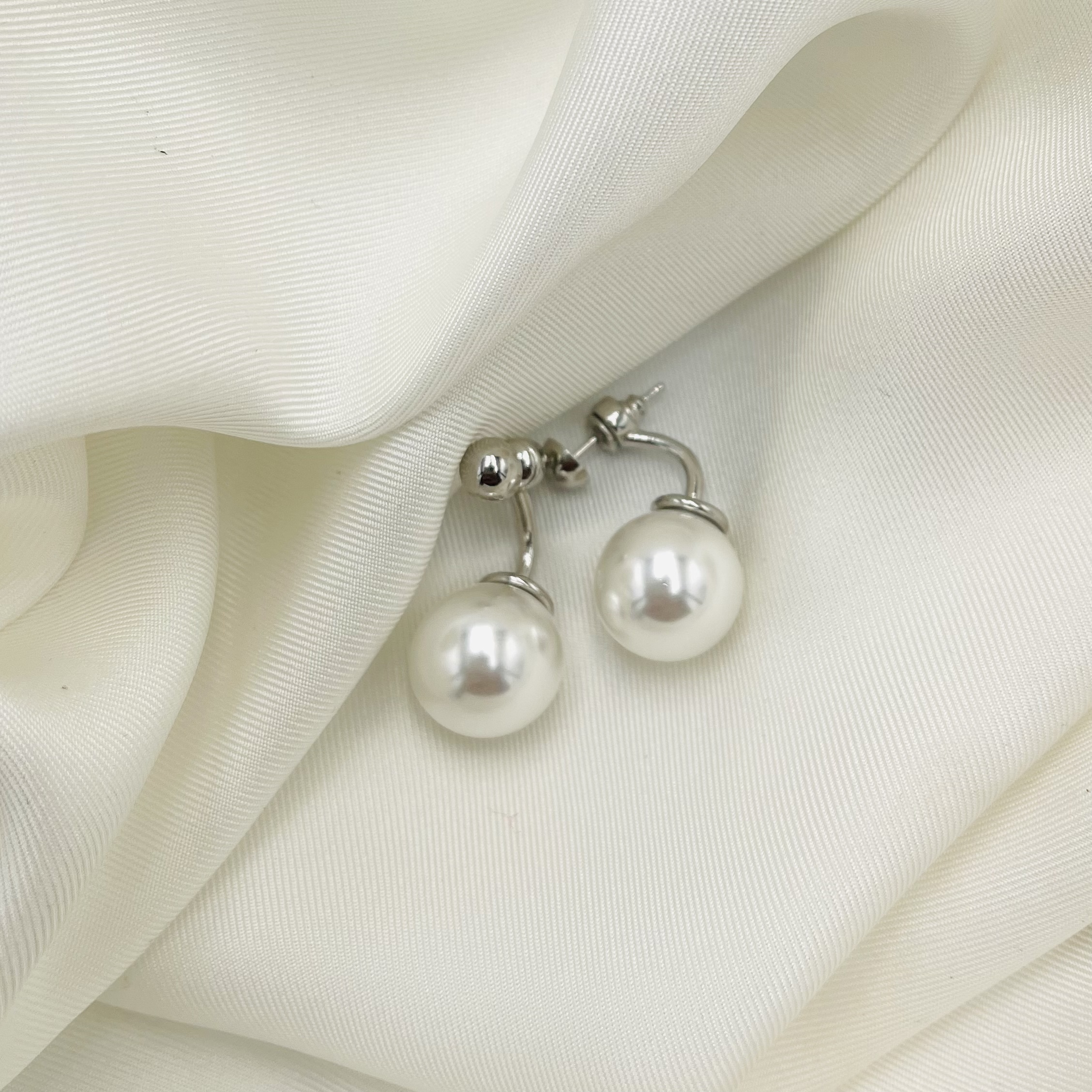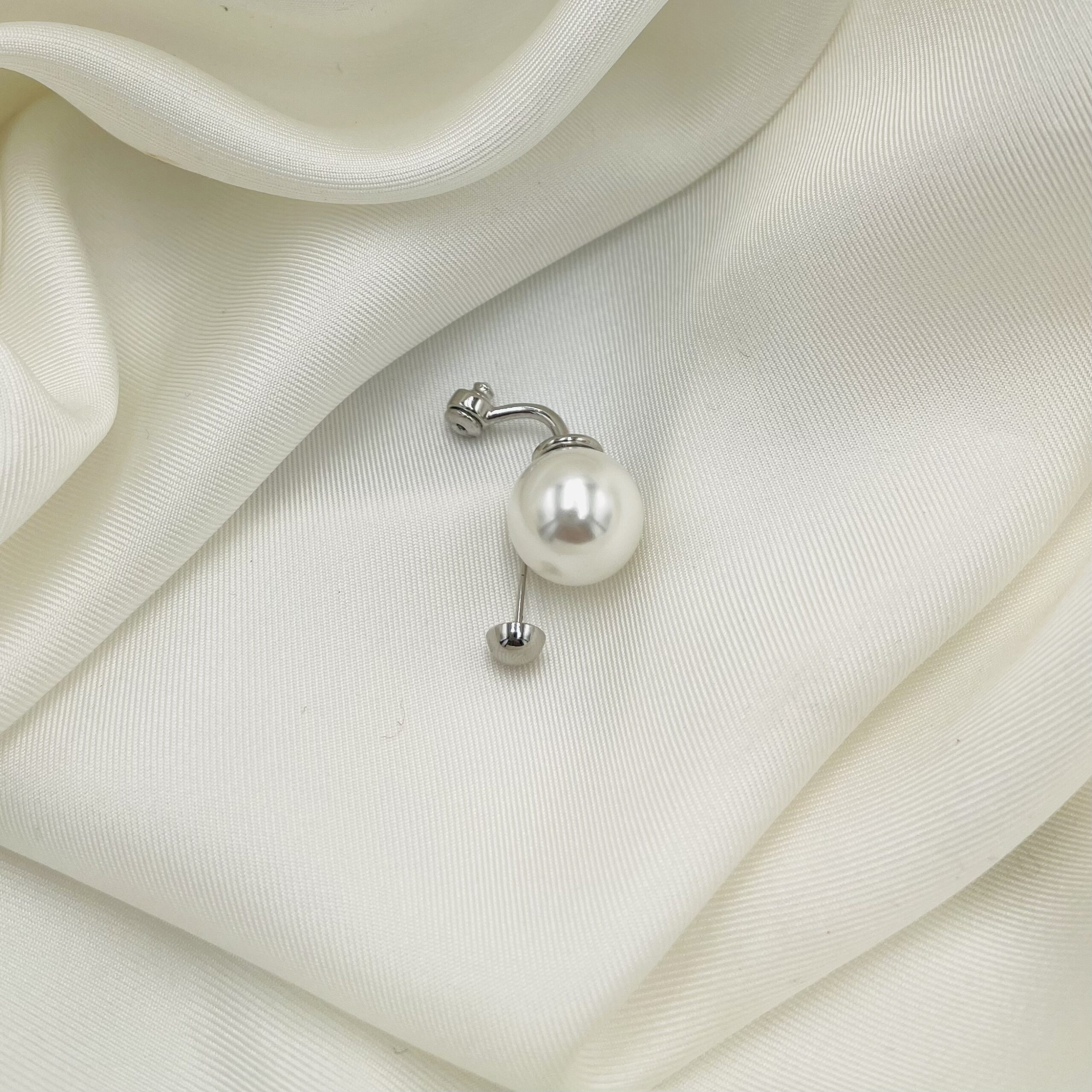 Σκουλαρίκια κρεμαστά σε ασημί χρώμα, κατασκευασμένα απο ανοξείδωτο ατσάλι. Διακοσμημένα με μια κρεμαστή πέρλα. Το κόσμημα αποτελείται από ένα καρφωτό, minimal σκουλαρίκι και ένα κούμπωμα από το οποίο κρέμεται η πέρλα. Με αυτόν τον τρόπο μπορούν να φορεθούν και ξεχωριστά, δημιουργώντας τον αγαπημένο σας συνδυασμό. Διάσταση: 2,8εκ.