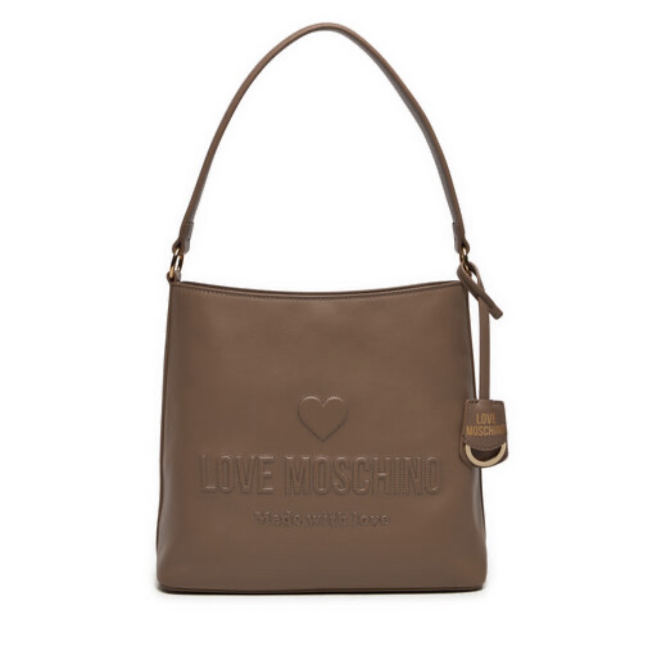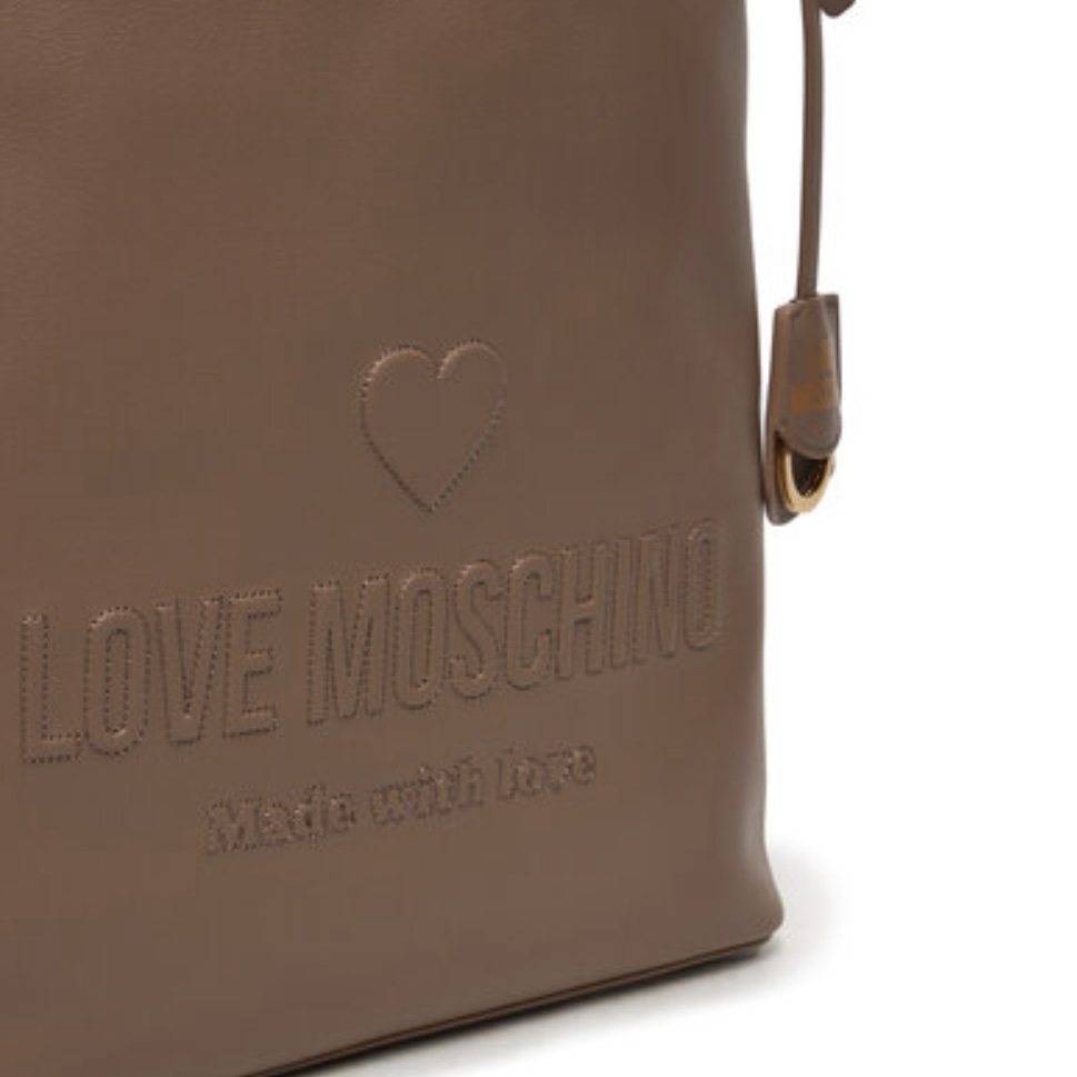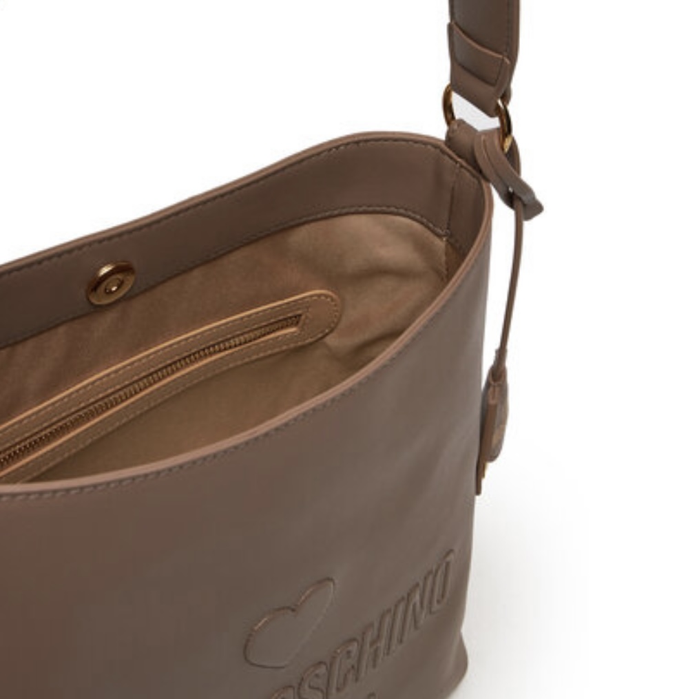 Τσάντα Love Moschino σε μπεζ/γκρι χρώμα, κατασκευασμένη απο φυσικό δέρμα. Διακοσμημένη με το λογότυπο του brand, το οποίο είναι είναι χαραγμένο στην μπροστινή πλευρά της καθώς και με ένα μπρελόκ. Στο εσωτερικό της διαθέτει δύο αποθηκευτικές τσέπες εκ των οποίων η μια ασφαλίζει με φερμουάρ. Περιλαμβάνει δύο σταθερές λαβές ώμου για να μετατρέπεται στην απόλυτη τσάντα ώμου. Ασφαλίζεται με μαγνητικό κούμπωμα. Διαστάσεις: Π:25κ, Υ:28κ, Β:5εκ.