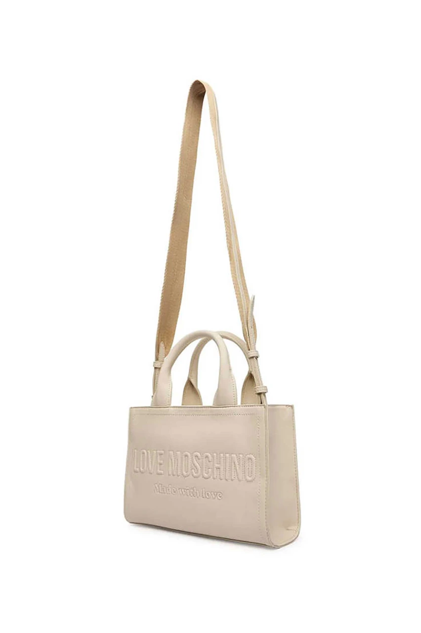 Τσάντα χειρός Love Moschino σε εκρου χρώμα. Διακοσμημένη με ανάγλυφο λογότυπο στο μπροστινό μέρος.Ασφαλίζεται με φερμουάρ.Ρυθμιζόμενο μακρύ λουράκι ώμου.Διάσταση: 18 x 26 x 6 cm.