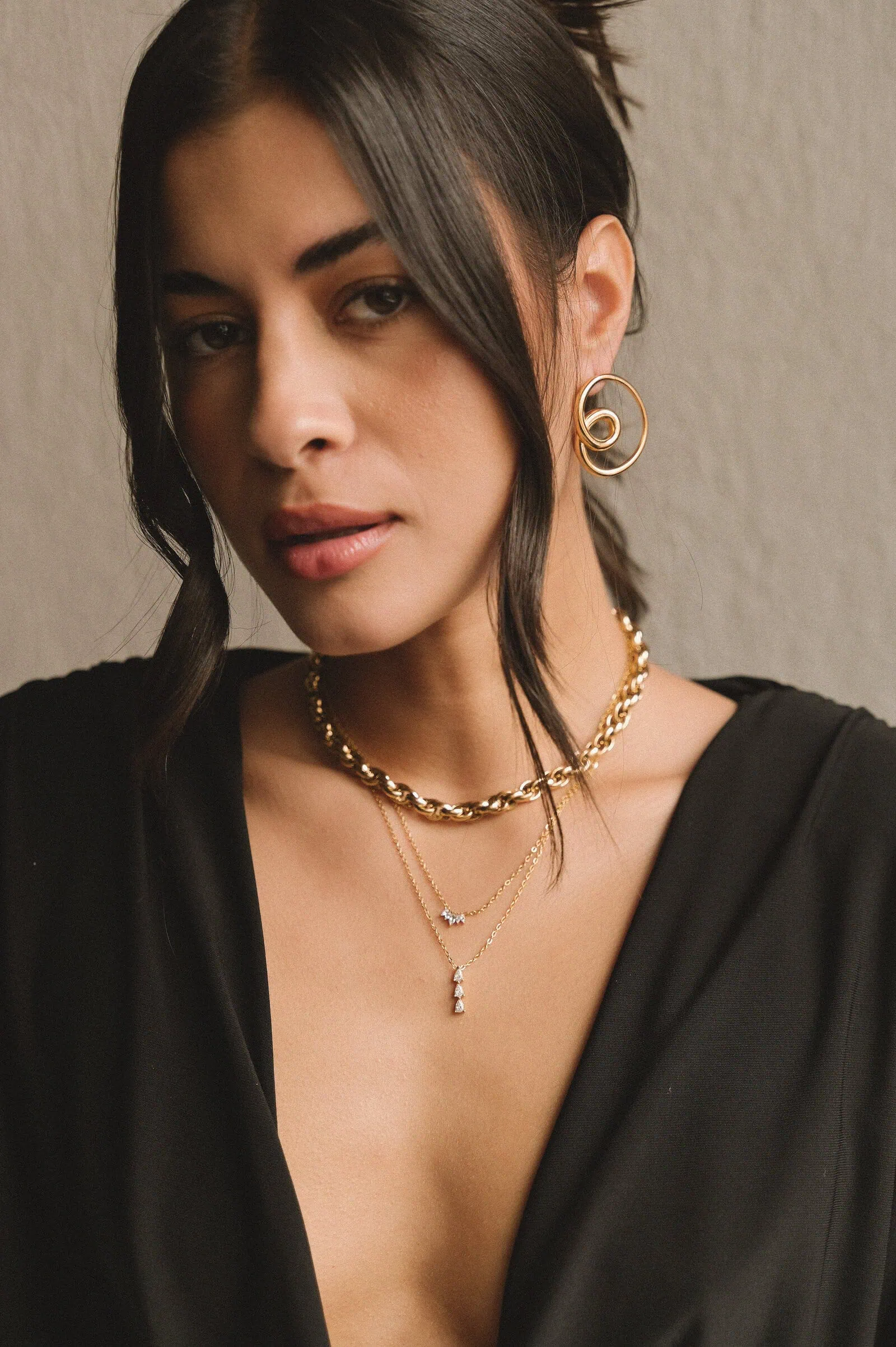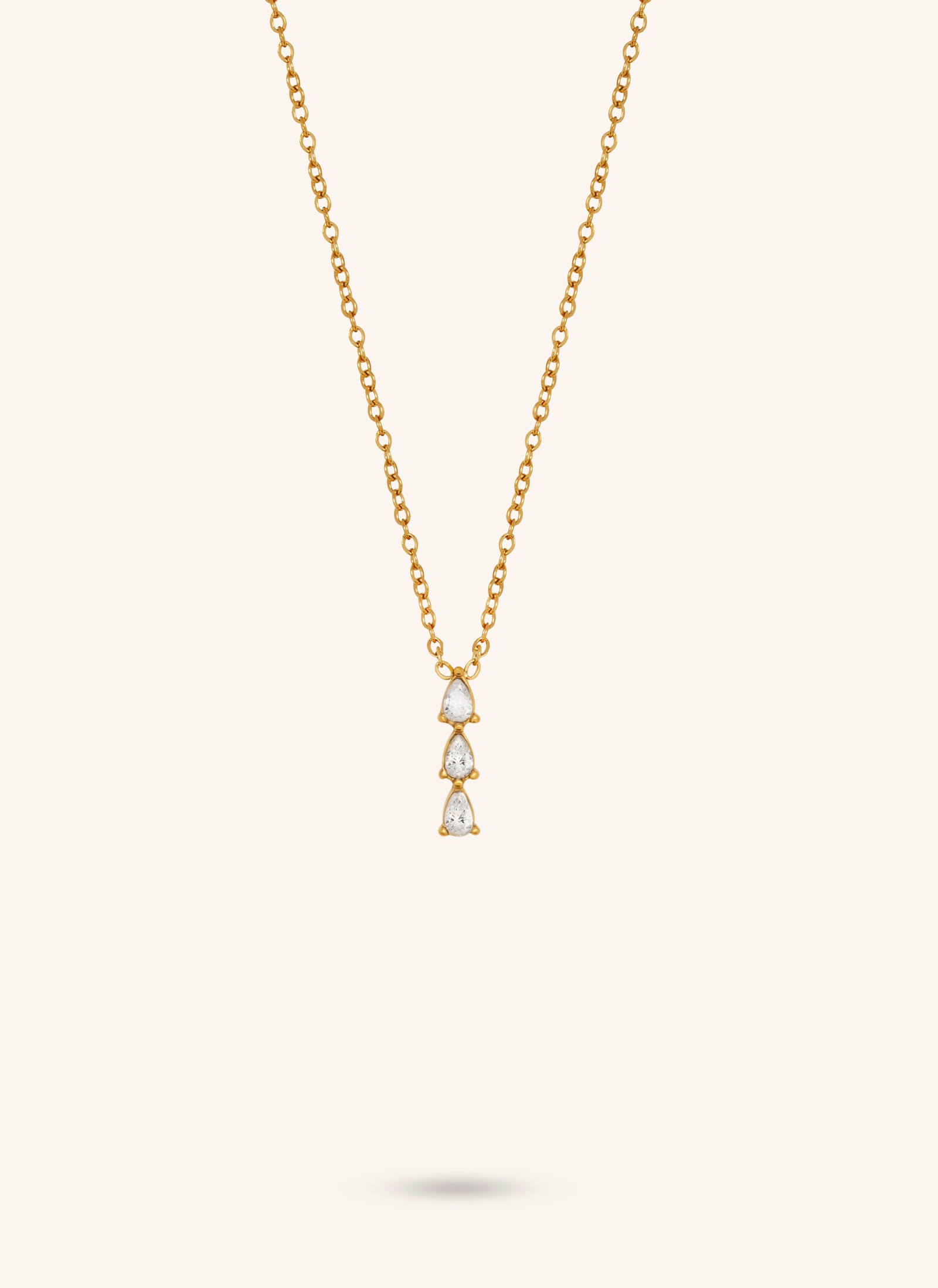 Κολιέ από ατσάλι με κάθετο στοιχείο από τρεις λευκές σταγόνες. Φοριέται διακριτικά με πουκάμισα ή minimal tops για καθημερινή κομψότητα.