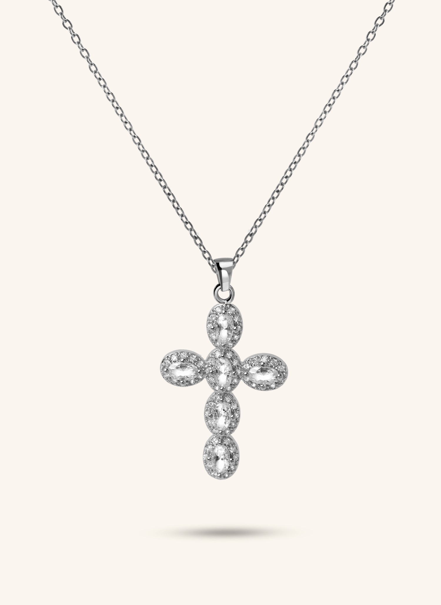 Κολιέ σταυρός με ζιρκόν σε ασημί χρώμα.Κατασκευασμένο από ανοξείδωτο ατσάλι.Προτεινόμενο μήκος αλυσίδας: 40cm (ξεκούμπωτη)