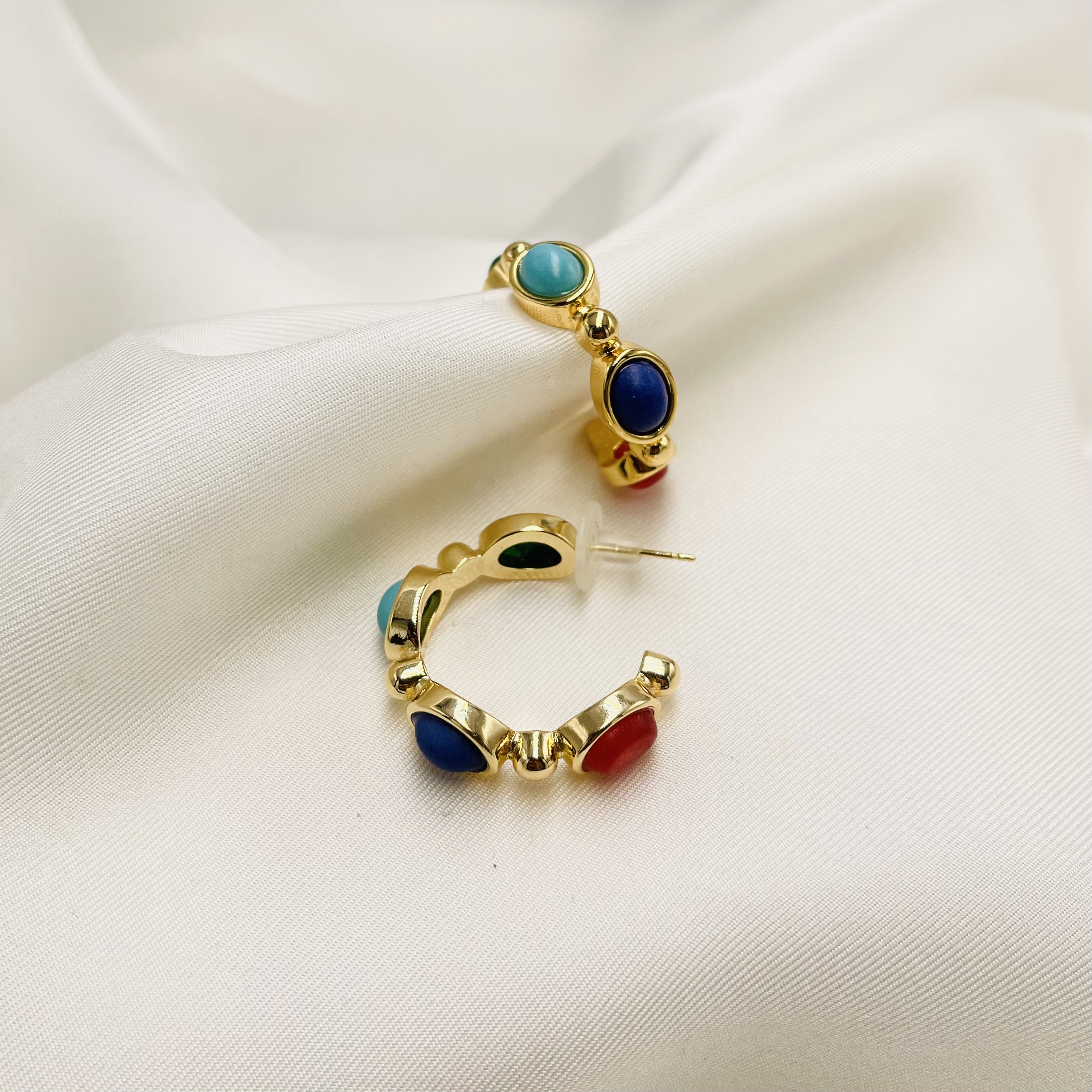Σκουλαρίκια κρίκοι σε χρυσό χρώμα, κατασκευασμένα απo ανοξείδωτο ατσάλι. Διακοσμημένα με πολύχρωμες πέτρες περιμετρικά του κρίκου. Διάμετρος: 2,3εκ.