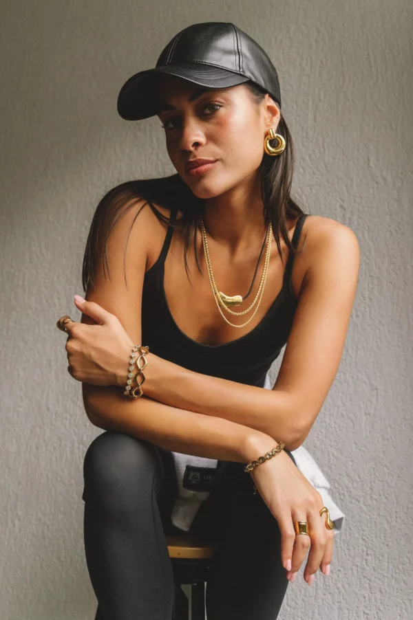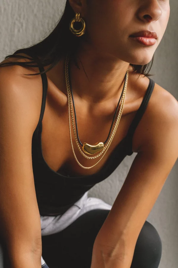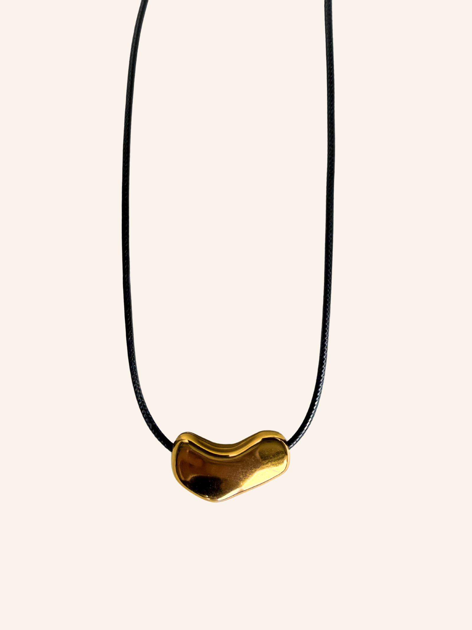 Ένα minimal κολιέ με μαύρο κορδόνι και χρυσό στοιχείο σε οργανικό σχήμα. Ιδανικό για να φορεθεί μόνο του ή σε layering με άλλα κοσμήματα για μοντέρνο αποτέλεσμα.